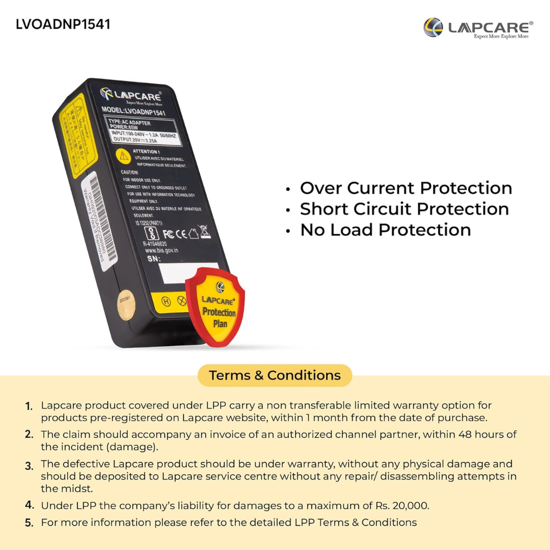 Lapcare Laptop Adapter Compatible For Lenovo 65w | 20v/3.25a | 7.9 x 5.5MM Big Pin
